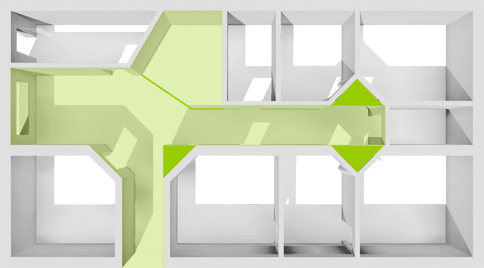 Um klare Raumkörper auszubilden, werden die abgeschrägten Ecken begradigt - und sinnvoll genutzt, zum Beispiel mit einer durchgesteckten Garderobe. In freundlichen Farben setzen sich die Körper von der neuen Akustikdecke und vom hellbeigen Linoleumboden ab. In den Schattenfugen liegende Bilderschienen sollen Fotoarbeiten tragen.